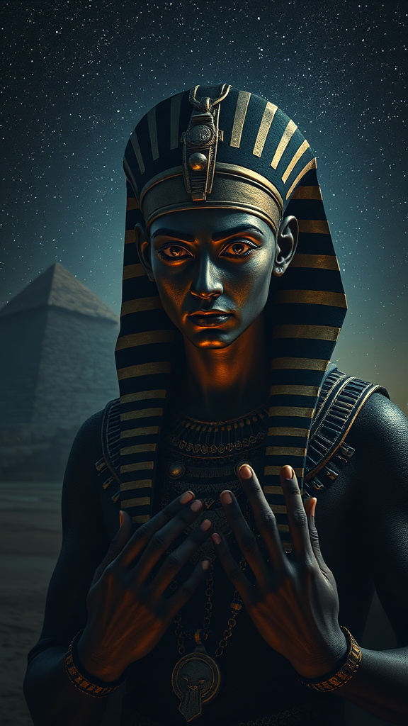 A highly detailed and mysterious Egyptian figure stands prominently with skindentation, captivating bright eyes that seem to hold ancient secrets. In the background, the majestic pyramids under a vast, starry sky enhance the enigmatic aura. The scene is photorealistically captured with cinematic lighting that casts dramatic shadows, creating a masterpiece quality reminiscent of a painting. The figure's attire and jewelry are intricate, adding layers of depth and history. Their hands, though slightly obscured, exude a sense of grace and authority. The composition, influenced by ancient art yet with a touch of modern interpretation, invites viewers into a world of wonder and timeless mystery.