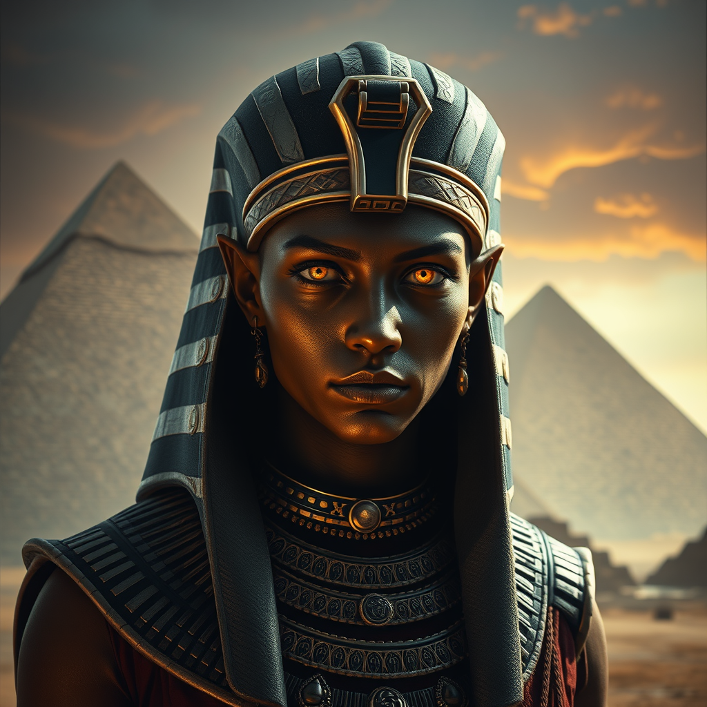 A highly detailed and mysterious Egyptian figure with luminous, captivating eyes stands before the backdrop of ancient pyramids, capturing a sense of enigma and wonder. The setting is bathed in cinematic lighting that accentuates the intricate skindentation and ornate details of the figure’s attire. The scene is a photorealistic masterpiece, evoking the grandeur and mystique of ancient Egypt. Despite the allure, there is an unconventional touch in the composition—subtle imperfections reminiscent of a painting by an artist known for unique, distorted perceptions. This artistic choice adds an unexpected dimension, blending realism with an abstract twist to create a truly captivating visual experience.