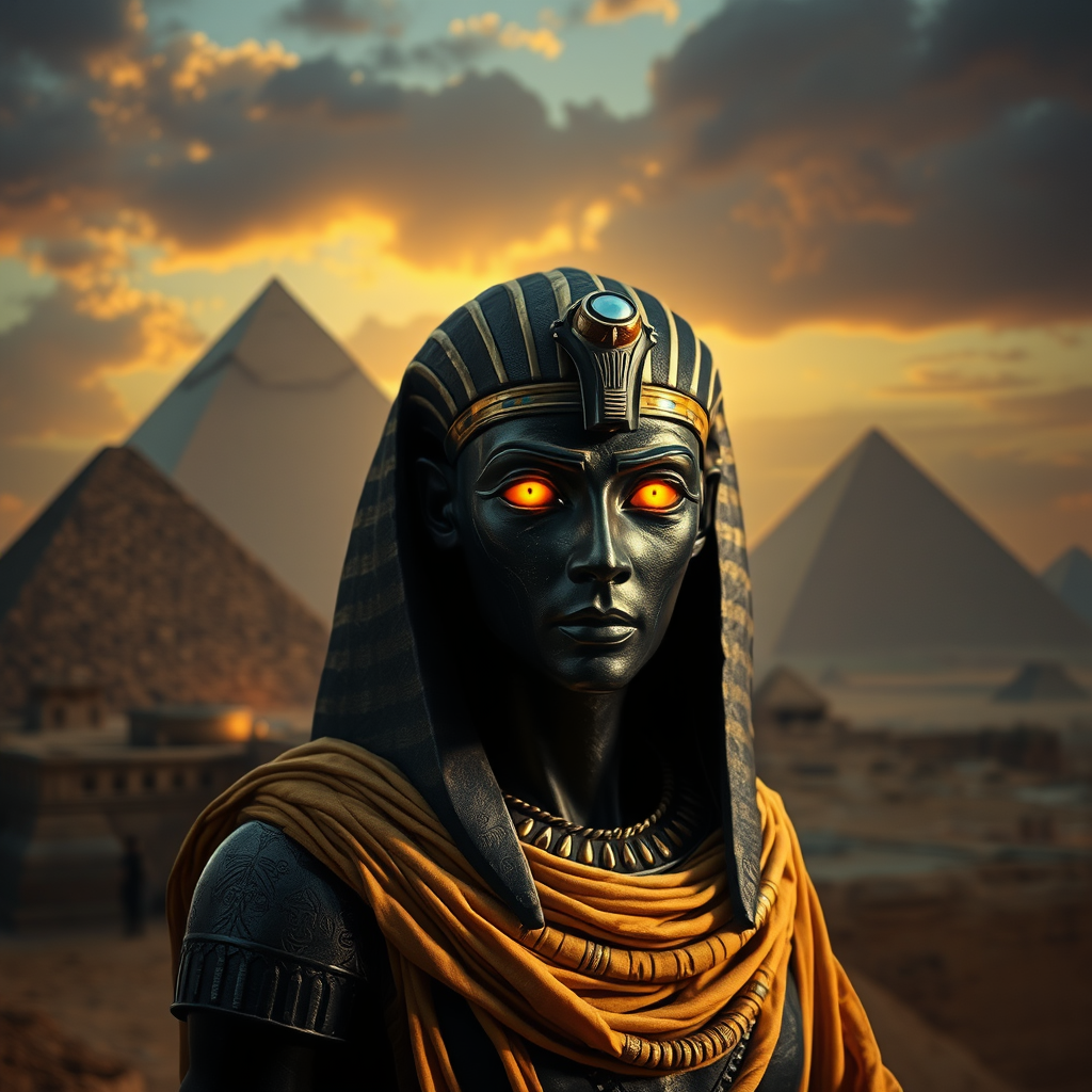 A highly detailed and mysterious Egyptian figure with captivating bright eyes stands against the backdrop of ancient pyramids. The scene is photorealistic and cinematic, capturing the essence of a masterpiece with dramatic lighting. The figure's enigmatic presence exudes an air of timeless intrigue, surrounded by the mystical allure of the Egyptian landscape. The artistry and craftsmanship are reminiscent of a painting by a skillful artist, presenting an inspiring blend of history and imagination.