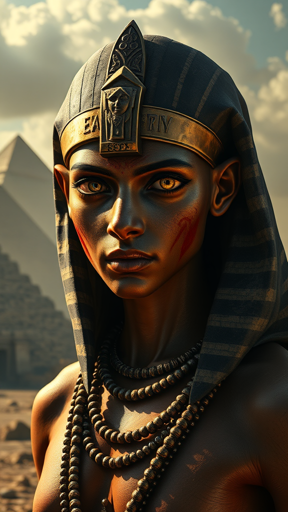 A highly detailed and mysterious Egyptian figure with strikingly bright eyes stands against the backdrop of ancient pyramids. Their skin exhibits subtle skindentation, adding realism and depth to the scene. The composition is photorealistic, capturing the majestic grandeur of ancient Egypt in a cinematic masterpiece. The lighting enhances the mystical atmosphere, casting dramatic shadows and highlights that accentuate the enigmatic expression of the figure. Painted with a unique, intriguing style, the artwork exudes an aura of otherworldly mystery and timeless elegance.