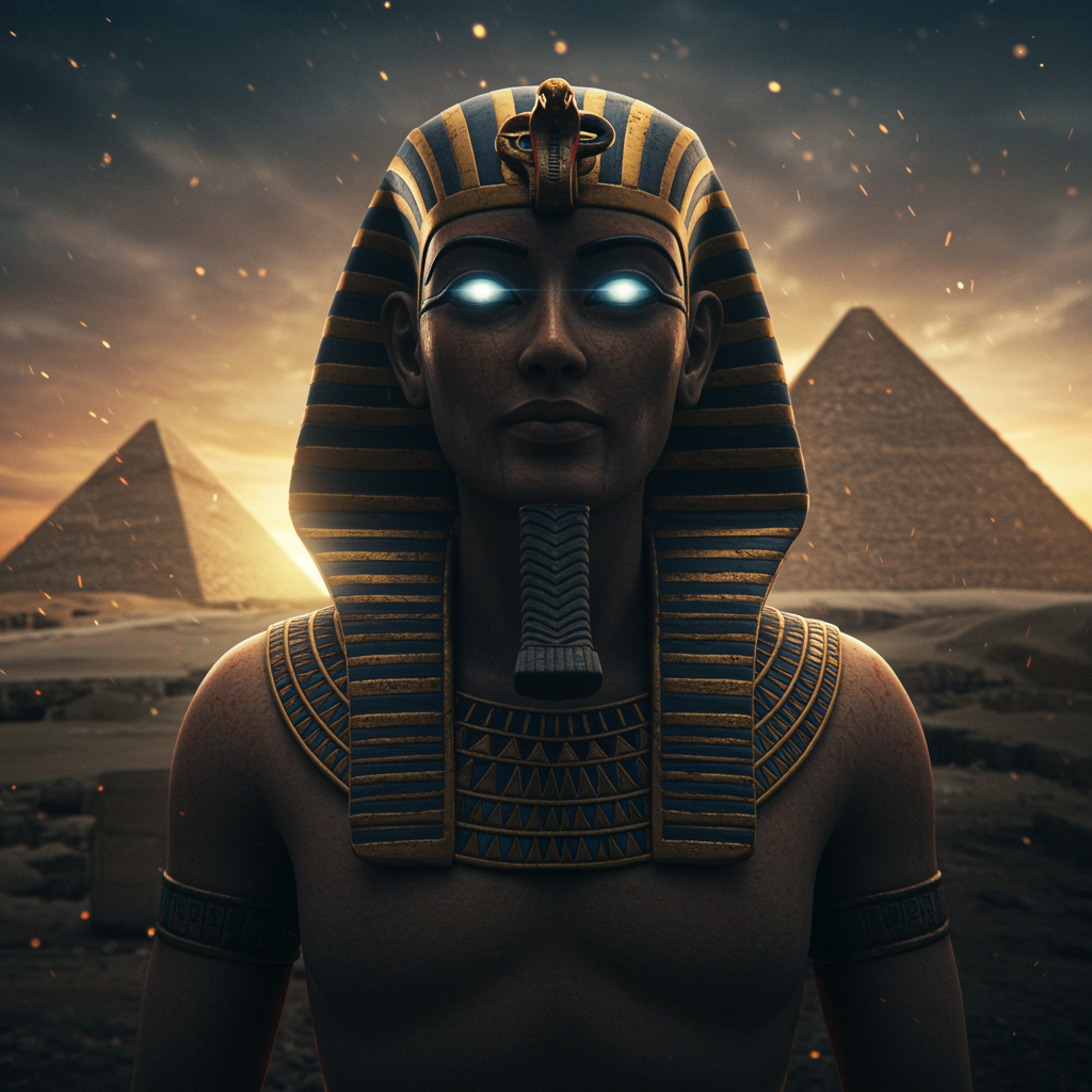 A highly detailed and mysterious Egyptian figure with strikingly bright eyes stands against the backdrop of ancient pyramids, surrounded by an aura of cinematic lighting. The scene is depicted in a photorealistic and cinematic masterpiece style. The skin displays subtle skindentation, adding depth and realism to the figure's appearance. The atmosphere evokes a sense of wonder and intrigue, reminiscent of a painting by a classic master, yet with a modern twist. The composition skillfully blends elements of ancient mystique with contemporary artistic flair, creating a captivating and enigmatic image.