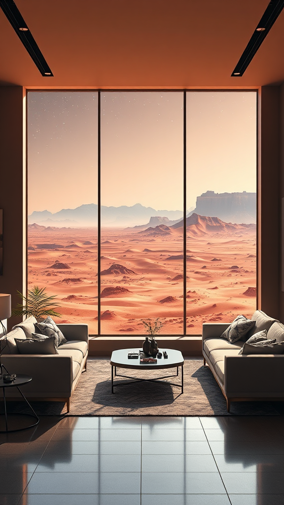 A highly detailed and photorealistic digital artwork of a modern living room featuring large windows that offer a breathtaking view of the Martian surface. The room is tastefully decorated with sleek, contemporary furniture in neutral tones, complemented by vibrant accents. The Martian landscape outside is an otherworldly panorama of red dunes and distant mountains under a clear, star-studded sky. This captivating scene is painted with intricate detail, capturing the essence of fantasy and realism, reminiscent of works by artists like Midjourney and Greg Rutkowski, with a matte finish and subtle touches of Bryan Organ's style, designed as an 8k wallpaper with unity and high detail.