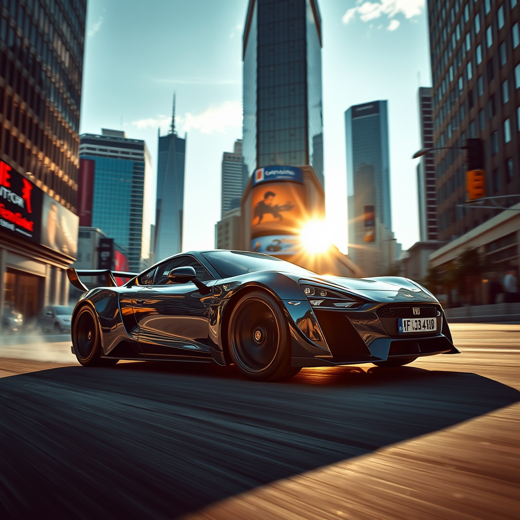 A highly detailed and photorealistic image showcasing a RUF CTR cruising through a bustling city at midday, with vibrant urban life reflecting off its sleek, polished surface. The sun casts sharp shadows, accentuating the CTR's aerodynamic shape, while towering skyscrapers create a dynamic backdrop. The scene captures a cinematic feel, with exquisite attention to the interplay of light and reflection, capturing the essence of speed and sophistication in an ultra-realistic 8K resolution. The city is alive with a mixture of modern architecture and classic urban elements, adding depth and character to the visual narrative.