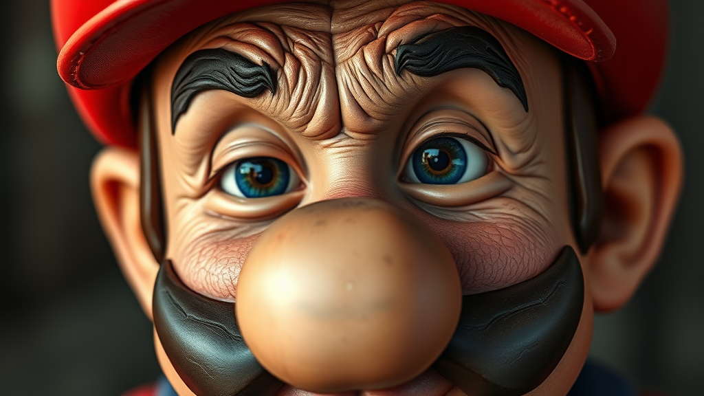 A highly detailed and photorealistic portrait of an aged Super Mario showcasing intricate textures and signs of fatigue, with deep skin pores and a worn expression. He wears his iconic red hat, captured with perfect lighting that emphasizes a realistic look. The image offers a hard focus with a smooth depth of field, shot in 8K UHD for exquisite detail. Photographed using a Sony Alpha 1 with an 85mm lens at f/1.4 aperture, 1/500 shutter speed, and ISO 100. The colors are neutral and muted to enhance the natural appearance. The depiction avoids any unrealistic or distorted features, presenting a genuine, authentic character without flaws or inaccuracies in anatomy.