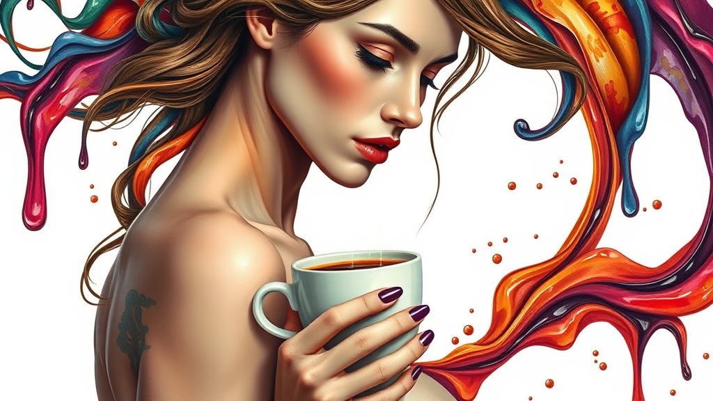 A highly detailed and realistic composition depicting a female figure with exquisite features, where vibrant rivulets of paint cascade elegantly across her form, merging art and life. Clad in a graceful blend of colors, she holds a steaming cup of coffee, her expression serene yet contemplative. Her pose is dynamic, embodying both movement and stillness against the purity of a white background. The painted textures blend seamlessly with her skin, creating a mesmerizing interplay of human and artistic elements.