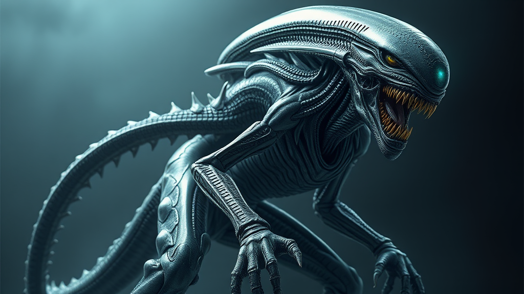 A highly detailed and realistic depiction of a full-body alien, exuding an aura of terror and fierceness, its presence both intimidating and awe-inspiring. The creature stands tall with an elongated frame, menacing eyes that glow with an otherworldly intensity, and skin textured like a predator's armor. Sharp claws and jagged teeth hint at its predatory nature, with intricate patterns and colors that shimmer and shift, creating a sense of dynamic movement. Its stance is poised and ready, capturing the essence of an apex lifeform from an unknown world.