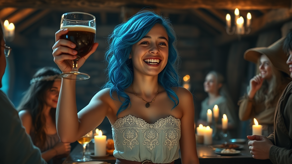 A highly detailed and realistic full-body photo from a fantasy movie shows a young girl with vibrant blue hair cascading over her shoulders, wearing a delicately embroidered white strapless tube top. She is caught in a moment of pure joy, her laughter infectious as she raises a goblet of wine in a lively medieval tavern. Around her, rustic peasants engage in merry conversation, their faces lit by the flickering glow of candlelight. The scene is bathed in ethereal blue volumetric lighting, adding a magical ambiance to the lively setting. The ultra-detailed and cinematic rendering captures every texture and nuance, from the wooden beams of the tavern to the whimsical attire of the patrons.