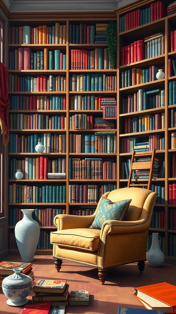 A highly detailed and realistic image of a cozy armchair and a towering bookshelf, showcasing vibrant triadic colors with bold, expressive brushstrokes. The scene is accentuated with porcelain elements, adding an elegant touch, while maintaining a perfect balance in a 3:2 aspect ratio. The room exudes warmth and sophistication, inviting you to dive into the world of books.
