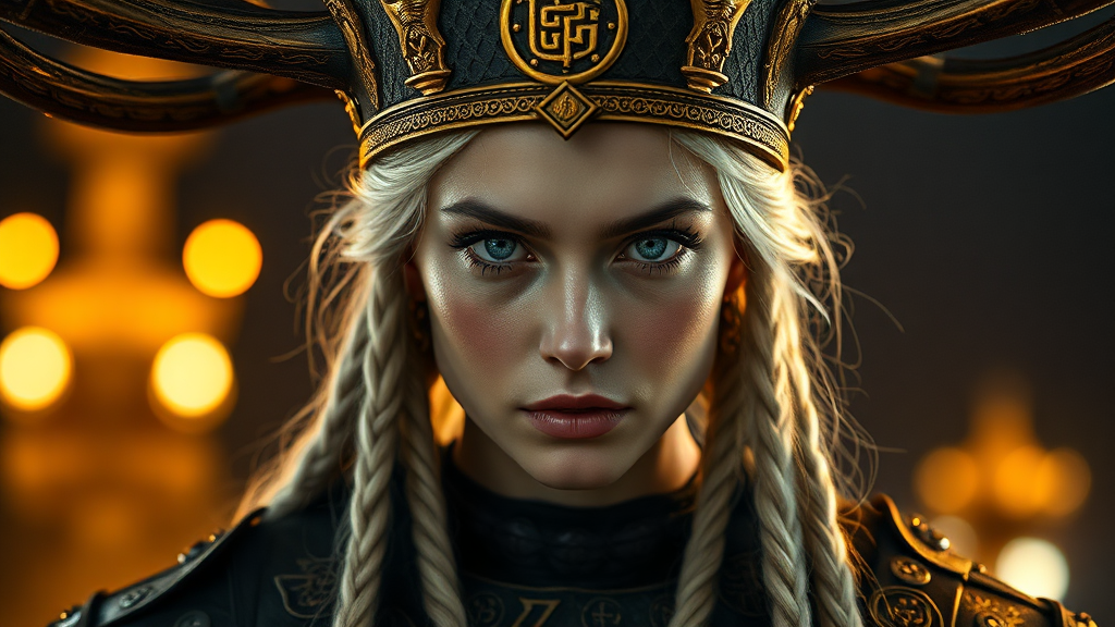 A highly detailed and realistic photograph captures a formidable Viking warrior princess clad in complex, dark armor adorned with intricate symbols. Her majestic presence is enhanced by an elaborate moose crown intertwined with a grand golden tiara, embodying a fusion of tribal and barbaric aesthetics with a touch of high fashion elegance. Her symmetrically beautiful face showcases striking, realistic eyes and intricate braids of platinum blonde hair, framing her pale skin tone. The princess gazes into the camera with an arrogant expression, set against a night backdrop illuminated by warm lighting. The medium close-up shot, taken with a Canon 5D using a 100mm lens, emphasizes hyper-realism and extraordinary detail, showcasing the hard rim lighting. The overall image is award-worthy, capturing the essence of a warrior princess who exudes strength and regality.