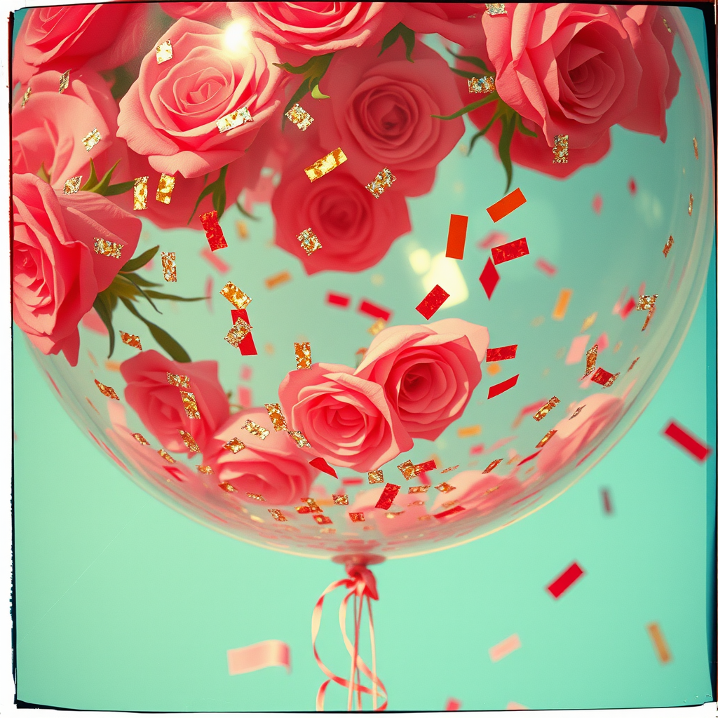 A highly detailed and realistic photograph capturing a gigantic transparent balloon filled with vibrant roses and shimmering confetti, shot in a nostalgic disposable camera style, rich in color and texture, aspect ratio 3:4.