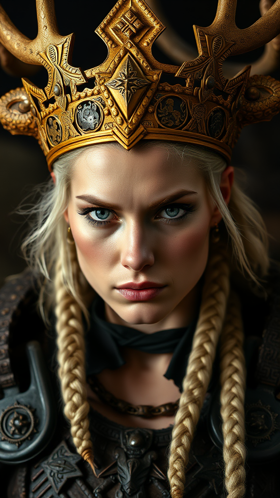 A highly detailed and realistic photograph of a commanding Viking warrior princess, adorned in complex dark armor with an intricate, enormous moose crown. She wears a regal golden tiara, embodying tribal and barbarian elements with a touch of Victoria's Secret allure. Her armor is adorned with symbols, showcasing a beautiful symmetrical face, impressive braided platinum blonde hair, and striking symmetrical eyes with a realistic gaze. Her pale skin is depicted in a photorealistic manner as she looks directly into the camera with an arrogant expression. Captured at night outdoors with warm lighting, the image features a medium close-up shot using a Canon 5D and a 100mm lens, prioritizing hyper-realism and detail with award-winning, hard rim lighting photography. The warrior exudes power and elegance without unproportionate features or imperfections, maintaining perfect skin and natural proportions, ensuring top quality with no signs of distortion or digital artifacts.