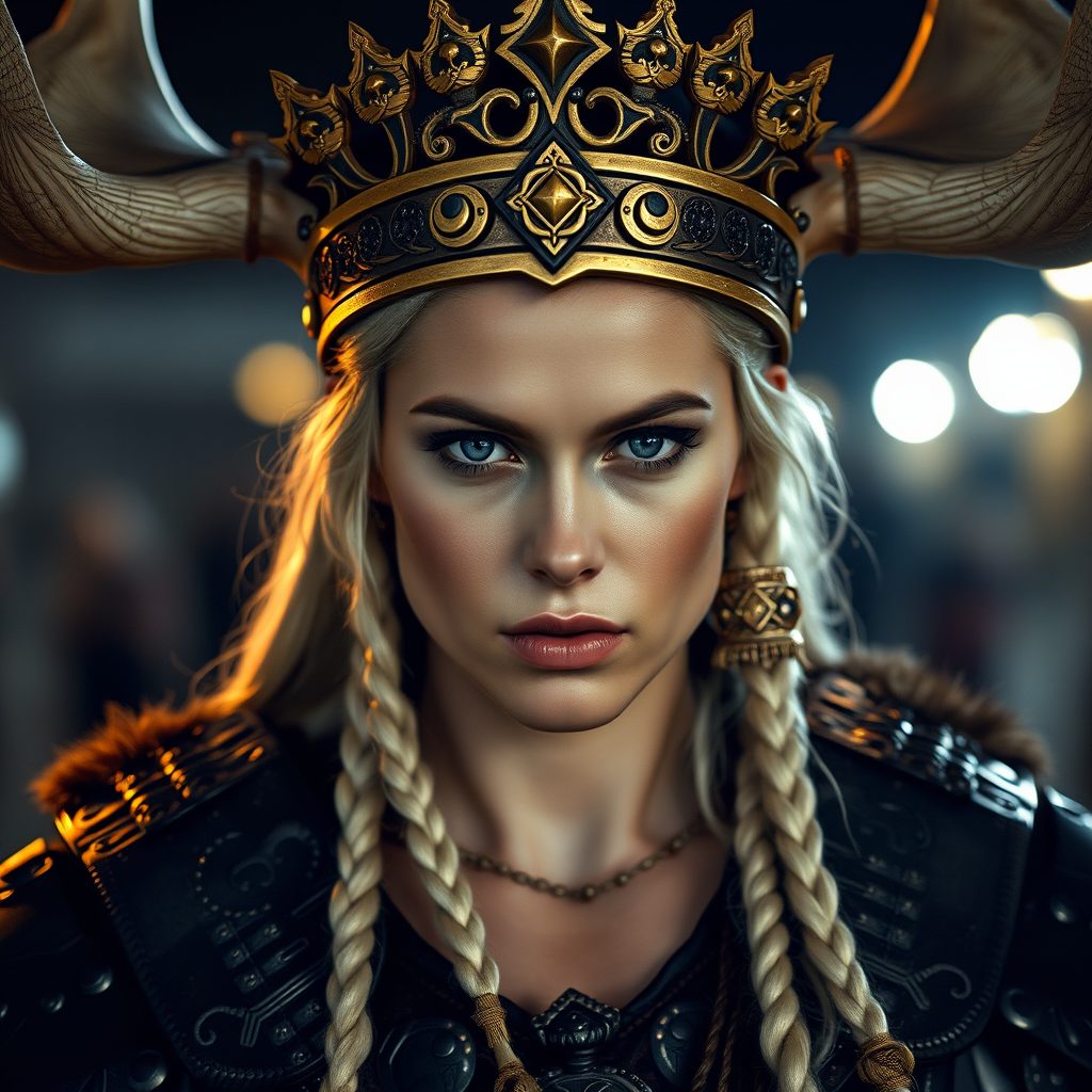 A highly detailed and realistic photograph of a commanding Viking warrior princess wearing intricately designed, dark armor. She dons an enormous, ornate moose crown topped with a majestic golden tiara. Her look is a blend of tribal and barbarian aesthetics, akin to a Victoria's Secret fantasy with elaborate armor adorned with mystical symbols. Her stunning face is perfectly symmetrical, featuring striking braided platinum blonde hair and piercing, symmetrical eyes with a realistic gaze. Her skin has a naturally pale tone, exuding an aura of authority as she confidently looks into the camera. Captured outdoors at night with a warm lighting setup, the image envelops her in an air of arrogance. The medium closeup provides a photorealistic view, captured with a Canon 5D and a 100mm lens, showcasing hyper-realism and high detail, characteristic of award-winning photography. The hard rim lighting accentuates her presence and power.