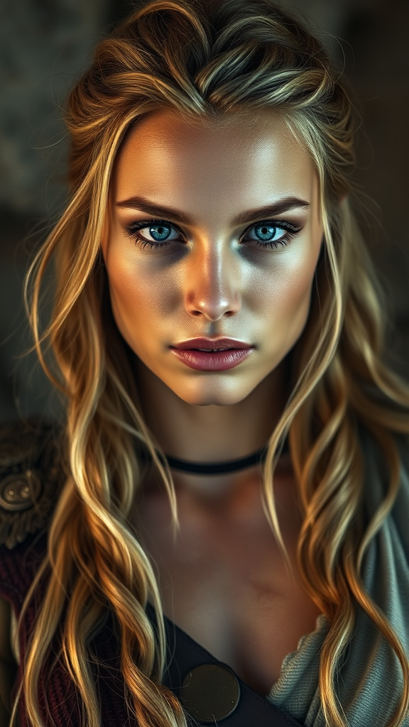 A highly detailed and realistic portrait of a stunning modern female Viking, captured in soft, natural lighting. This portrait photography features an 85mm lens with a touch of magical ambiance, showcasing dramatic lighting and photo realism. The composition is an ultra-detailed, intimate portrayal, akin to Cinestill 800T film. The character is beautifully rendered, avoiding errors such as missing or extra digits, with attention to anatomical accuracy. The image is clean and sharp, free of cropping issues, jpeg artifacts, or any disfigurement. It exhibits artistic beauty without imperfections, ensuring the subject is not blurry, fuzzy, or misshaped. The photograph respects artistic integrity, avoiding watermarks and maintaining a clean, aesthetically pleasing appearance.