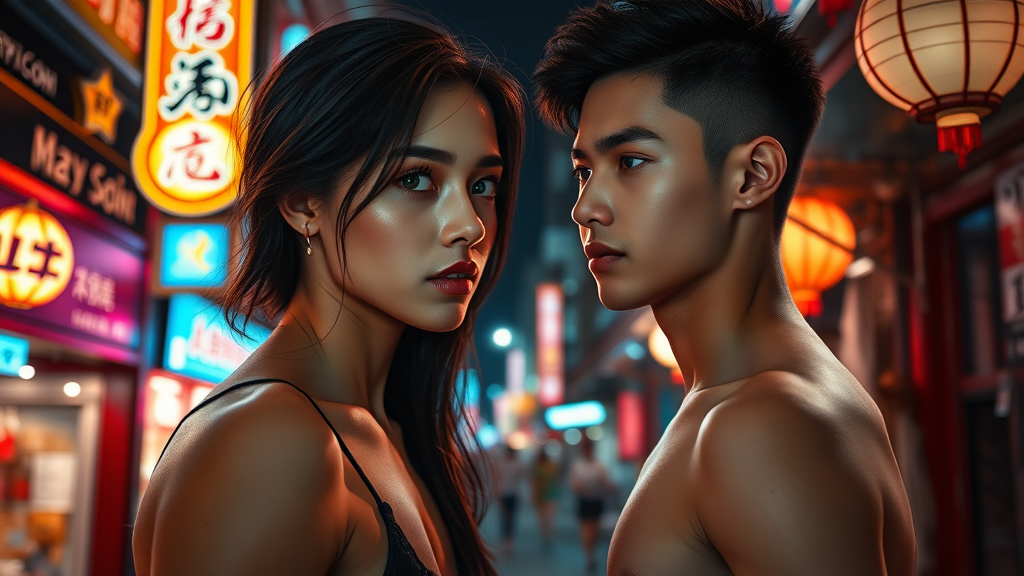 A highly detailed and realistic portrait of a stunning young supermodel girl and boy standing face to face in an atmospheric Asian market setting. The scene is illuminated by vibrant shop neon signs and the enchanting glow of night city lights. The girl possesses mesmerizing green eyes and a perfect fitness physique, accentuated by long, graceful legs. Her face is beautifully symmetrical, adorned with expressive doe eyes, charming freckles, and high cheekbones. Her long, cascading hair flows like ink, framing her delicate makeup and melancholy expression. The boy complements her presence with his striking appearance. The image captures an extradimensional quality in ultra HD 8k resolution, showcasing cinematic lighting, precise lens flare, and a dreamy bokeh effect. The captivating backdrop of the bustling market adds an intriguing layer to the scene, highlighting the chemistry and romantic connection between them.