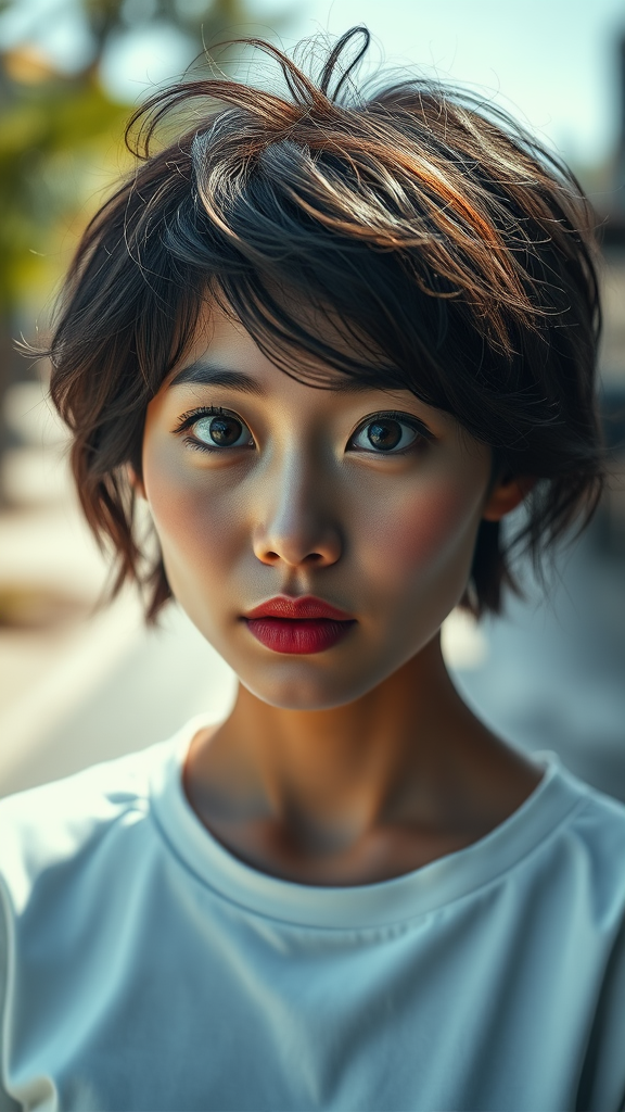 A highly detailed and realistic portrait of a woman with round expressive eyes and short, tousled hair, captured outdoors. She wears a simple white T-shirt and gazes intently into the camera, her lips slightly chapped. The image features soft, natural lighting with an enchanting touch, achieved through dramatic yet subtle illumination. The composition is intimate, capturing every ultra-detailed feature, creating a sense of closeness with the viewer. Photographed using a Leica 50mm lens at f/1.4, the portrait focuses on conveying a sense of realism and emotion. The subject, a Chinese woman with a graceful and natural presence, embodies a serene yet captivating aura.