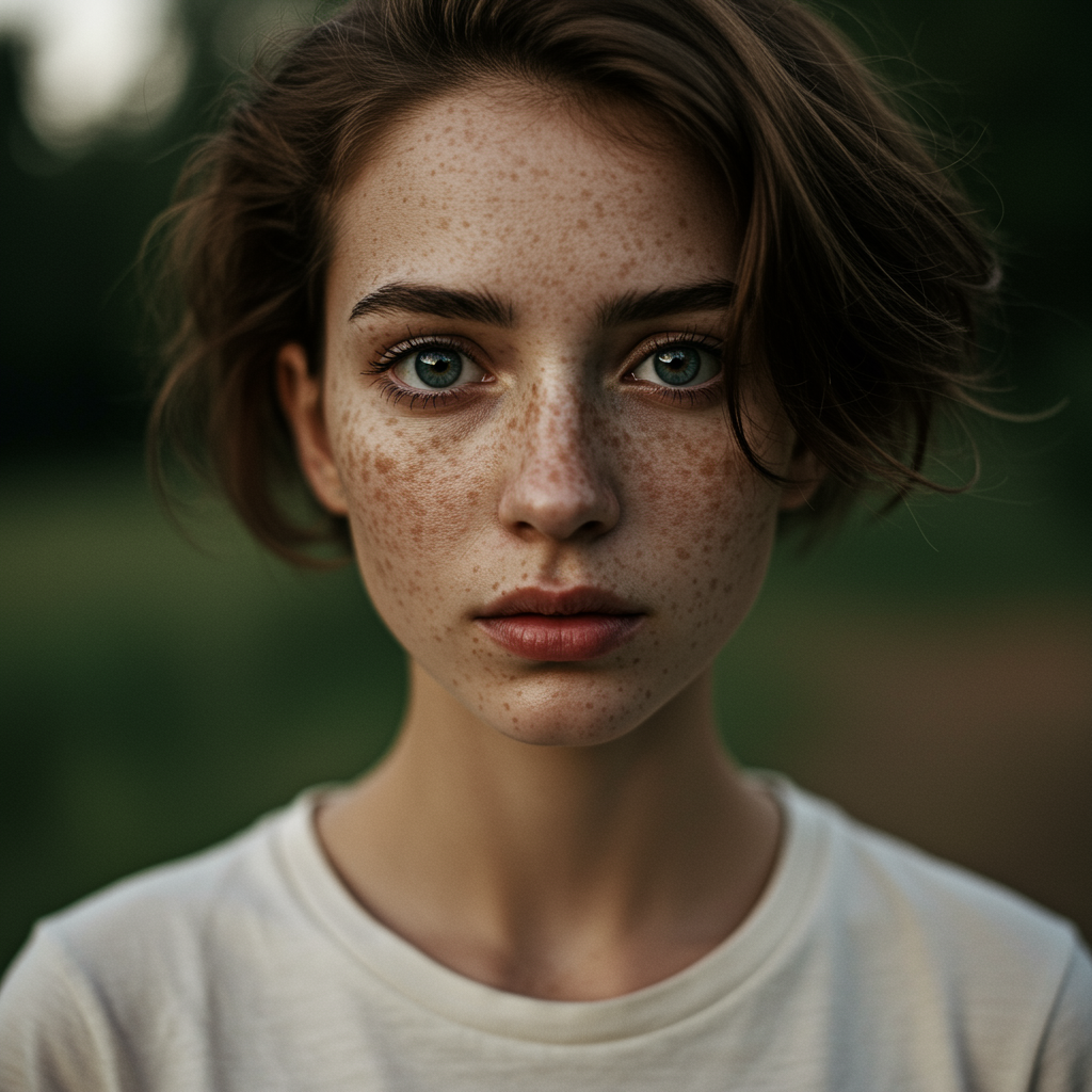 A highly detailed and realistic portrait of a woman with scattered freckles, large round eyes, and tousled short hair, captured outdoors. She's wearing a soft white t-shirt, gazing intently at the camera. Her lips are slightly chapped, accentuated by gentle natural light. The portrait exhibits magical and dramatic lighting, achieving a photo-realistic effect with ultra-detail. The intimate composition is reminiscent of Leica 50mm, f1.4 photography. The scene makes subtle use of warm tones, complementing the serene and slightly whimsical atmosphere.