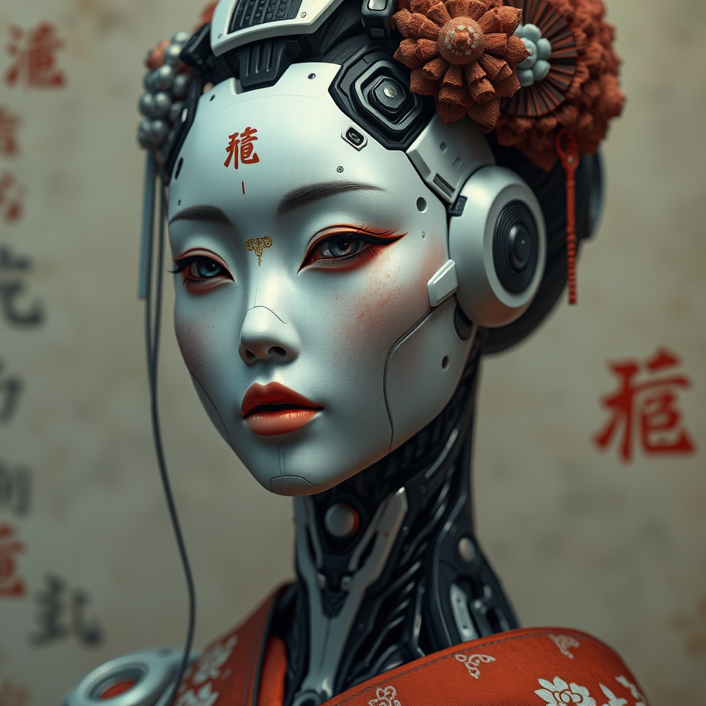 A highly detailed and realistic portrait painting of a Japanese robotic geisha, adorned with kanji symbols and intricate decals, created using Octane Render for lifelike textures in 4K resolution. This artwork blends the themes of Ex Machina and I, Robot, showcasing advanced technology and elegant design. The composition is carefully crafted to avoid common digital imperfections such as blurriness, low quality, and artifacts. The geisha's anatomy is accurately depicted, with attention to realistic proportions and detailed features. The background is seamlessly incorporated, ensuring a harmonious and immersive visual experience.