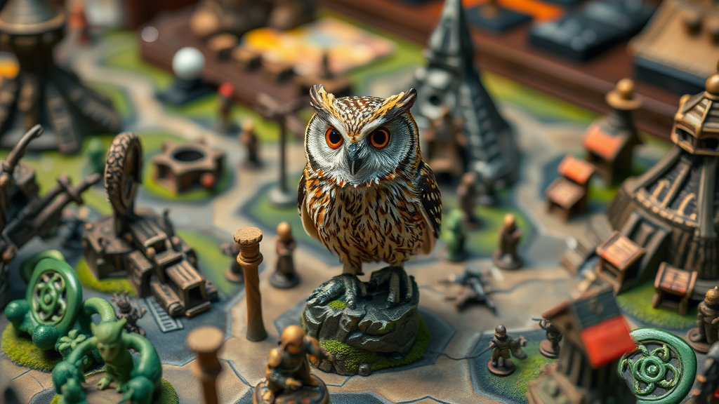 A highly detailed and sharply focused scene featuring a miniature owl perched on a tabletop battlefield, surrounded by intricate miniature figures and landscapes from a Dungeons & Dragons game, capturing the whimsical and strategic essence of the fantasy setting, with the owl's keen eyes surveying the imaginative world in an aspect ratio of 3:4.