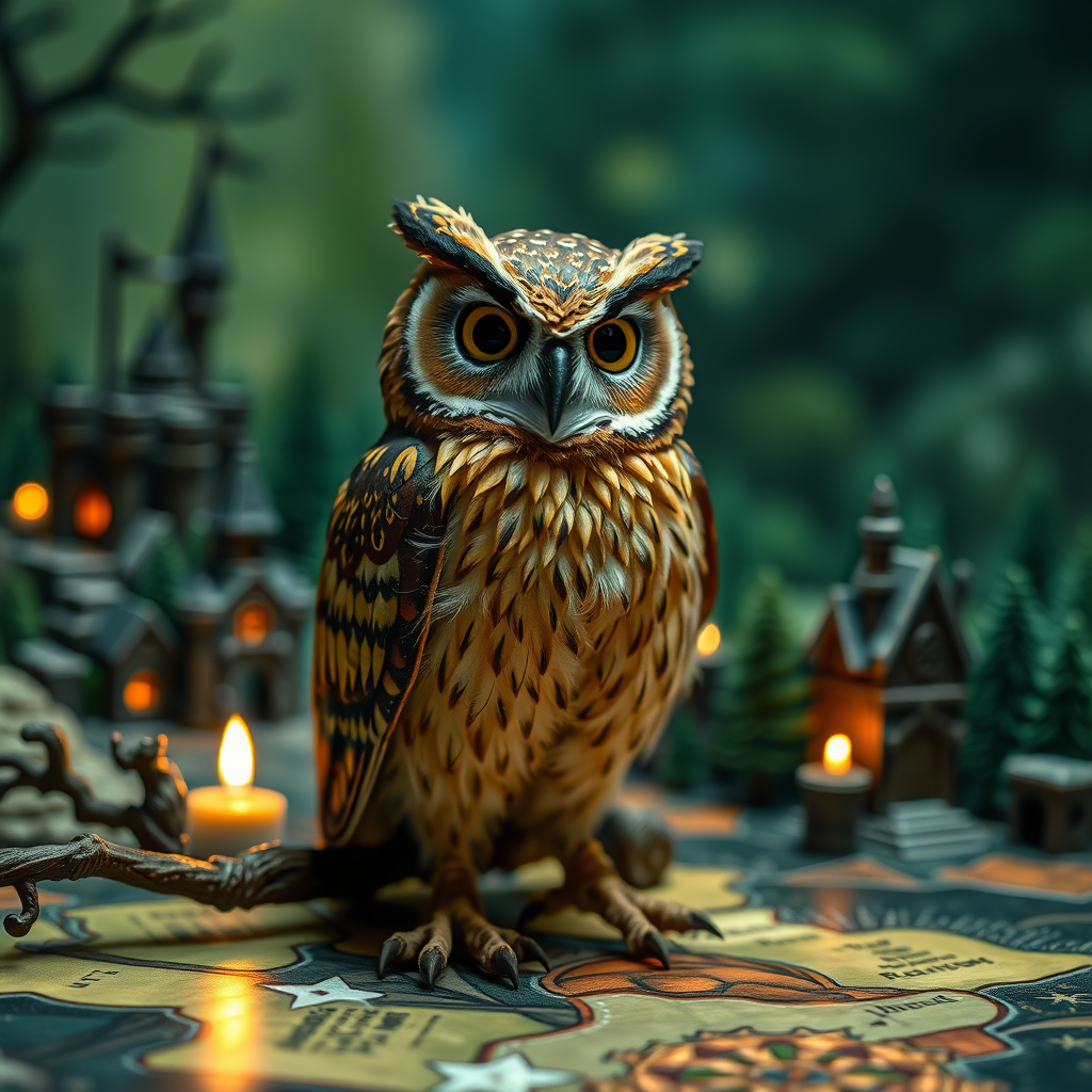 A highly detailed and sharply focused scene of a miniature owl perched on a Dungeons & Dragons game board, its feathers intricately textured, eyes gleaming with intelligence and curiosity, as it surveys the mystical landscape of tiny castles and magical forests, illuminated by the soft glow of scattered candles.