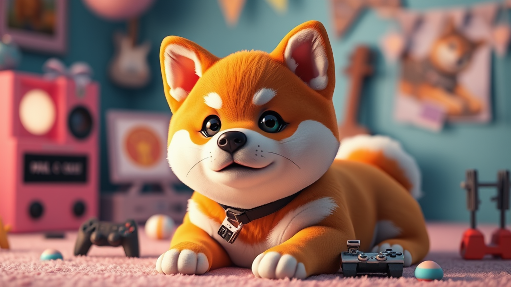 A highly detailed and ultra-realistic 3D render of an adorable Shiba Inu puppy in a Fortnite-inspired style, featuring intricate details and studio lighting. The scene is infused with soft pastel colors, enhancing the cuteness of the puppy. The setting is filled with playful props like tiny gaming-inspired elements, creating a whimsical and immersive environment.