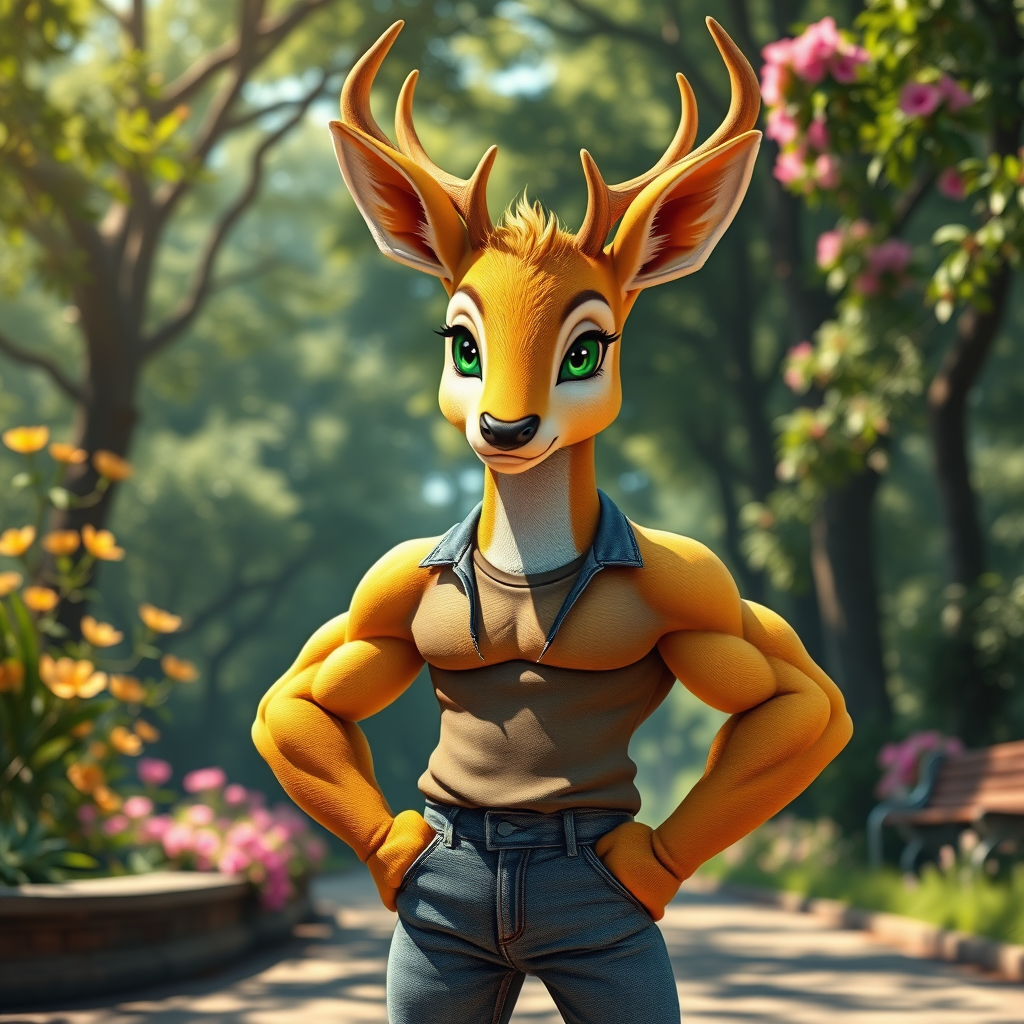 A highly detailed and ultra-realistic artwork depicting an anthropomorphic deer with soft, fluffy yellow fur and skin standing confidently in a park setting. This muscular character showcases striking green eyes that reflect the natural light around them, adding a sense of depth and life to the image. The deer is dressed in casual clothing, featuring fitted jeans that highlight its strong physique. The park background is adorned with lush greenery and vibrant blooms, enhanced by playful illumination and intricate shadows that dance across the scene. The scene captures subtle reflections and shines, elevating the overall quality. A warm, inviting smile graces the deer's face, adding a touch of personality and charm. Despite the emphasis on high quality and detail, there's a playful contrast hinted at with elements that could be seen as less polished, adding an intriguing layer to the artwork's narrative.