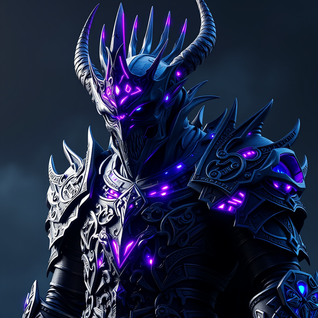 A highly detailed and ultra-realistic depiction of a chilling demon inspired by the Night King from Game of Thrones by George R. R. Martin, showcasing a full-body view. The demon is adorned in complex and intricate armor with shades of purple and blue glowing neon, enhancing its formidable presence. The armor is ornate, with a mix of ancient runes and modern elements. The scene is captured under dramatic, cinematic lighting that adds depth and intensity. This high-definition 4k image displays hyperrealistic details, created with Unreal Engine 5, capturing every nuance. The composition has a striking 9:16 aspect ratio, reflecting a trending art piece likely to be featured on ArtStation.