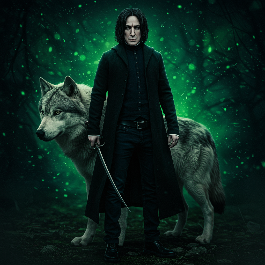 A highly detailed and ultra-realistic digital art portrayal of a distinguished British young man, inspired by Severus Snape, with striking black hair and piercing black eyes. He wears contemporary fashion, accentuating his very detailed eyes highlighted with subtle eyeliner. Accompanying him is his loyal companion, a majestic grey wolf, adding to the enigmatic scene. Crafted in the style of Justin Gerard and Greg Rutkowski, this full-body artwork features a Dark Ambient Inferno background with mystical green lights and vivid colors, epitomized in 16k UHD HDR10 resolution. Despite the surreal atmosphere, the depiction avoids distortions like disfigurement or mutation, capturing a refined essence with clarity and depth, free of distractions like watermarks or logos.