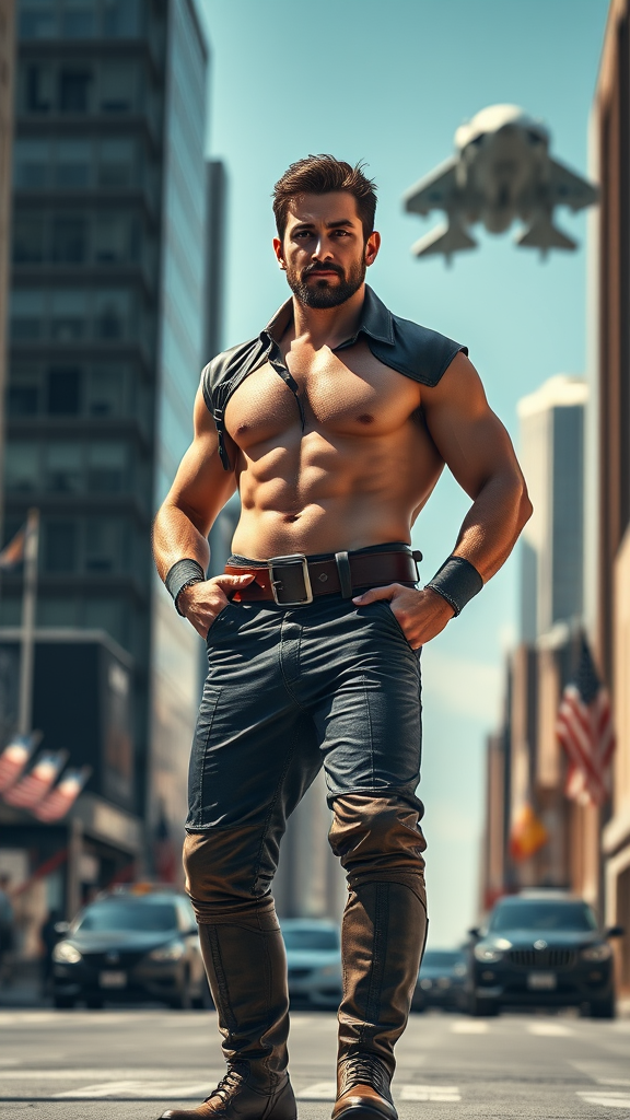 A highly detailed and ultra-realistic full-body portrait of a 28-year-old Israeli Caucasian male in a heroic pose. Featuring a dominant alpha male with muscular build, a hairy chest, and a sharp jawline, he stands confidently against a sunny NYC backdrop. His shiny hair complements pale skin and a smaller head with a defined nose. He wears breeches and a leather uniform, paired with tall, laceless driving boots. The scene includes the sci-fi element of a futuristic ship taking off, blending elements of action and epic storytelling. The image captures cinematic lighting with natural textures and blur effects, created using a Hasselblad X1D - 50c for an ultra-detailed, hyper-realistic 8K quality. The atmosphere is moody yet vibrant, reflecting cinematic rendering with an emphasis on photorealism and volumetric lighting.
