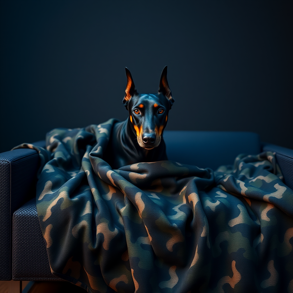 A highly detailed and vivid photograph captures a minimalist photo studio setting in UHD resolution. At the center, a sleek dark scheme camouflage textured sofa is adorned with a matching camouflage pattern blanket. Draped elegantly over the sofa, a black Doberman, partially covered by the blanket, gazes intently into the camera. The dog's expression is intense and focused, with its glossy coat complementing the textured pattern of the blanket. The image is bathed in the soft, realistic glow of dusk sunlight, highlighting the intricate details and textures. The depth of field is expertly controlled, drawing attention to the blanket's intricate patterns while maintaining an ultra-realistic ambiance. The composition, inspired by productivity in photography, uses creative angles to add a sense of depth and allure to the minimalist setting.