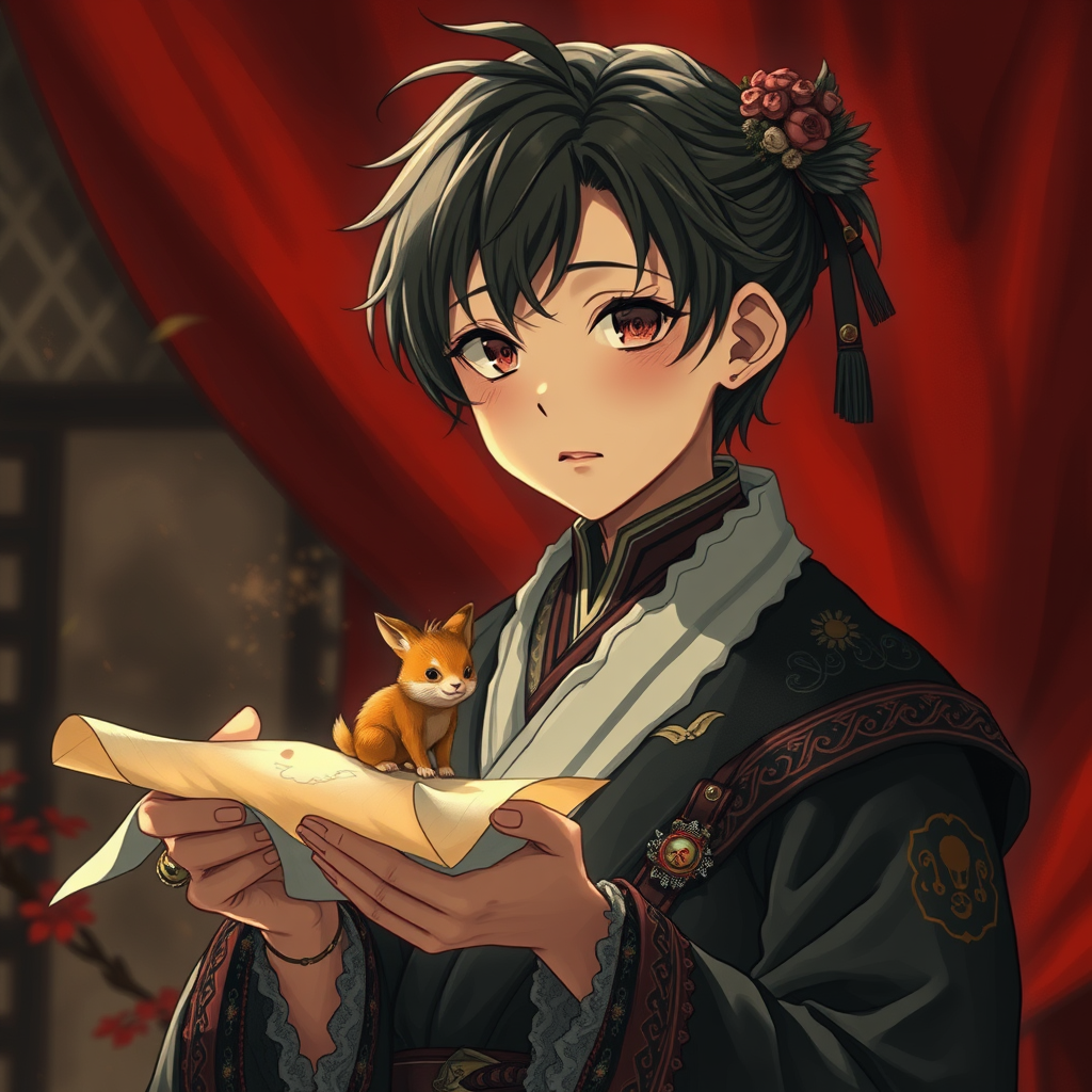 A highly detailed anime character reminiscent of a classic portrait, with intricate costumes inspired by Max Rive's landscapes and the elegant realism of Luke Fildes. The character is holding a piece of parchment that magically transforms into a small, lively animal in their hands. The setting is rich with red and brown hues, capturing a sense of warmth and earthiness, while the realist detail brings every aspect to life, echoing the bold and abstract essence of TarΕ Okamoto's work. The scene is captured in a style similar to Cinestill 50D film, with a raw, cinematic quality that emphasizes both the character's expressive features and the enchanting transformation, set against a backdrop of dramatic odds and mystic surroundings.