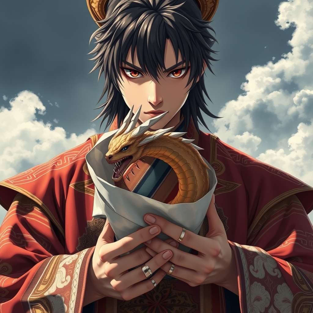 A highly detailed anime character stands firmly, their eyes focused and intense, as they grip a piece of paper that curls and twists into the shape of a mythical creature, captured with realist detail and vivid expression. The character's elaborate costume merges rich shades of red and brown, adorned with intricate patterns reminiscent of Max Rive's grand landscapes. The lighting and atmosphere evoke the crisp clarity of CINESTILL 50D, blending with the bold and dynamic artistic energy of TarΕ Okamoto. The composition carries the narrative depth found in Luke Fildes' works, achieving an arresting balance between realism and fantasy in a captivating depiction that reveals the inner spirit of the animal.