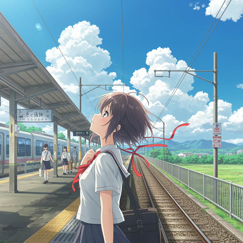 A highly detailed anime scene set on a bustling train station platform features a pretty anime girl with a strikingly beautiful face adorned with delicate red ribbons. The atmosphere is filled with the warmth of a sunny day, with fluffy clouds lazily drifting across an azure sky. The scene is rendered in soft focus, highlighting the bright, vivid colors typical of Makoto Shinkai's style. Gentle sunlight casts a radiant glow, creating an inviting and serene ambience as the girl glances up, her eyes reflecting a sense of wonder and anticipation.