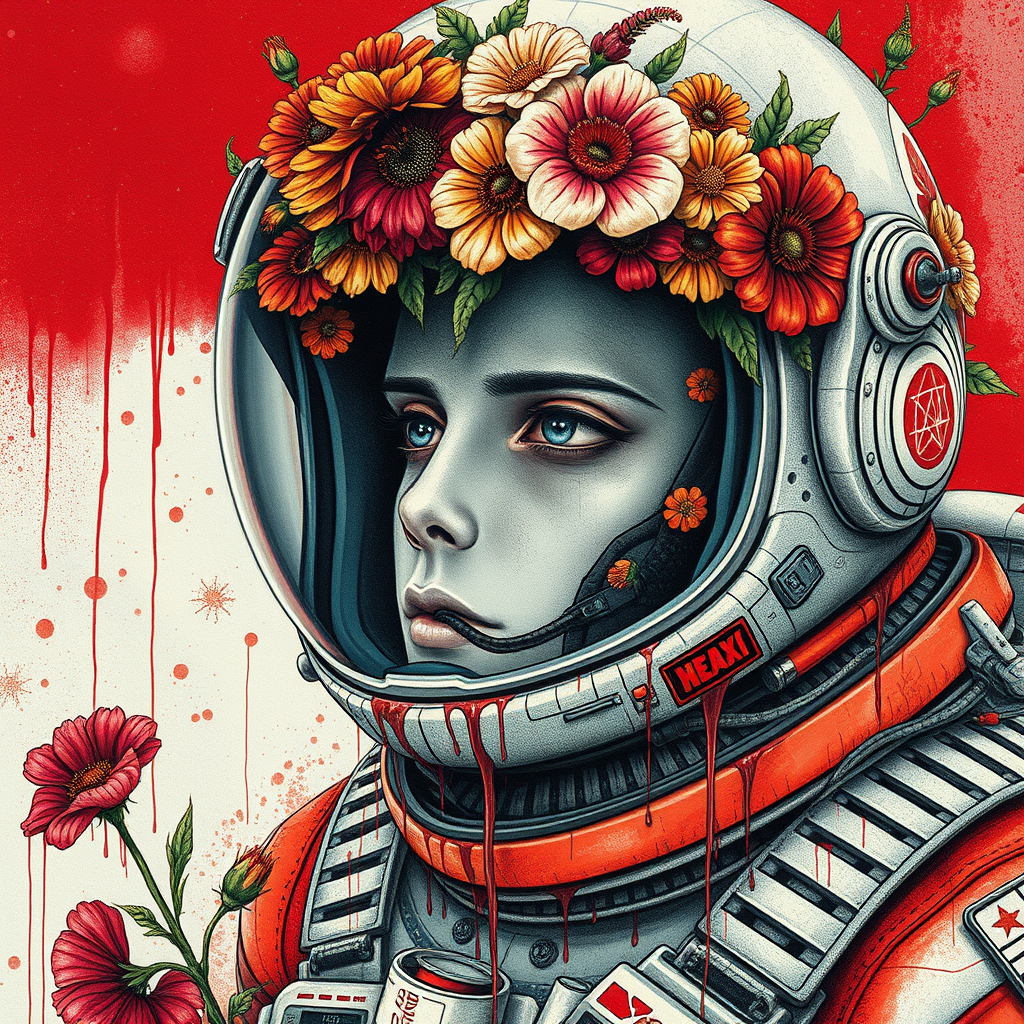 A highly detailed astronaut adorned with a helmet featuring a vibrant explosion of flowers, combined with intricate anatomical drawing elements, accented by layers of dripping paint. Infuse the scene with coquelicot red, creating a captivating depth of field, in a harmonious 9:16 composition, emphasizing quality and artistic innovation.
