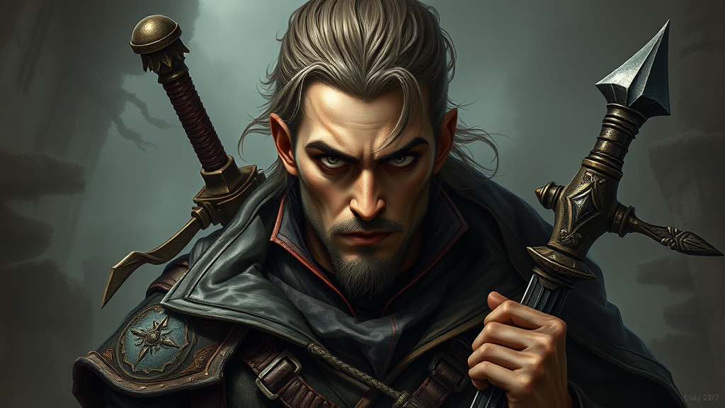 A highly detailed, award-winning portrait of a male rogue with symmetrical features, captured in a 16k masterpiece full body reference sheet in a fantasy RPG setting; evokes the essence of Dungeons and Dragons with intricate clothing, stealthy demeanor, and finely crafted weapons, set against a moody, immersive backdrop that hints at mysterious adventures.