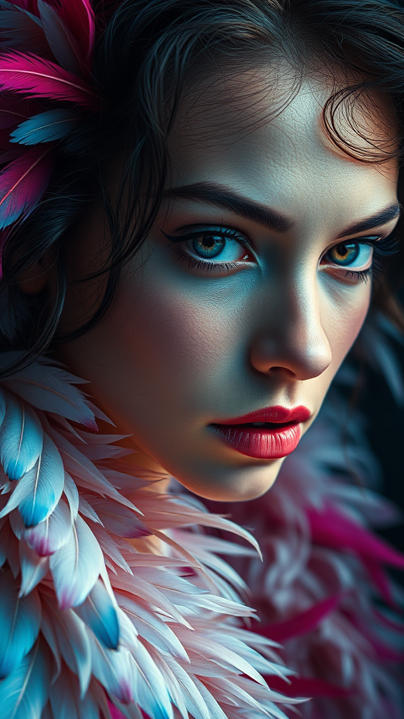 A highly detailed baroque portrait of Zoë Kravitz composed entirely of delicate and colorful feathers, presenting an incredible intricate masterpiece with hyper-realistic features. The artwork captures an air of elegance and sophistication, while maintaining a sense of fluidity and texture inherent in the feathers. Inspired by the style of Tom Bagshaw, the piece radiates a mystical allure, with soft shadowing and rich tones that enhance the visual depth and complexity of the portrait.
