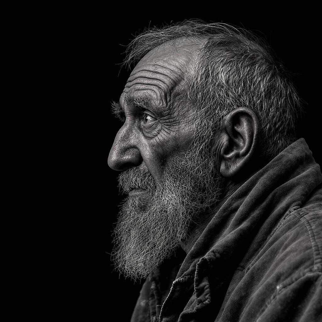 A highly detailed black and white side profile photo of a very tired and old homeless man, captured with a Mamiya camera, set against a deep black background. The man's facial expression is a complex tapestry of wisdom and the trials of time, mingled with a trace of deception, sadness, and madness. His weathered skin and deep-set eyes tell stories of hardship and survival in ultra-high definition.