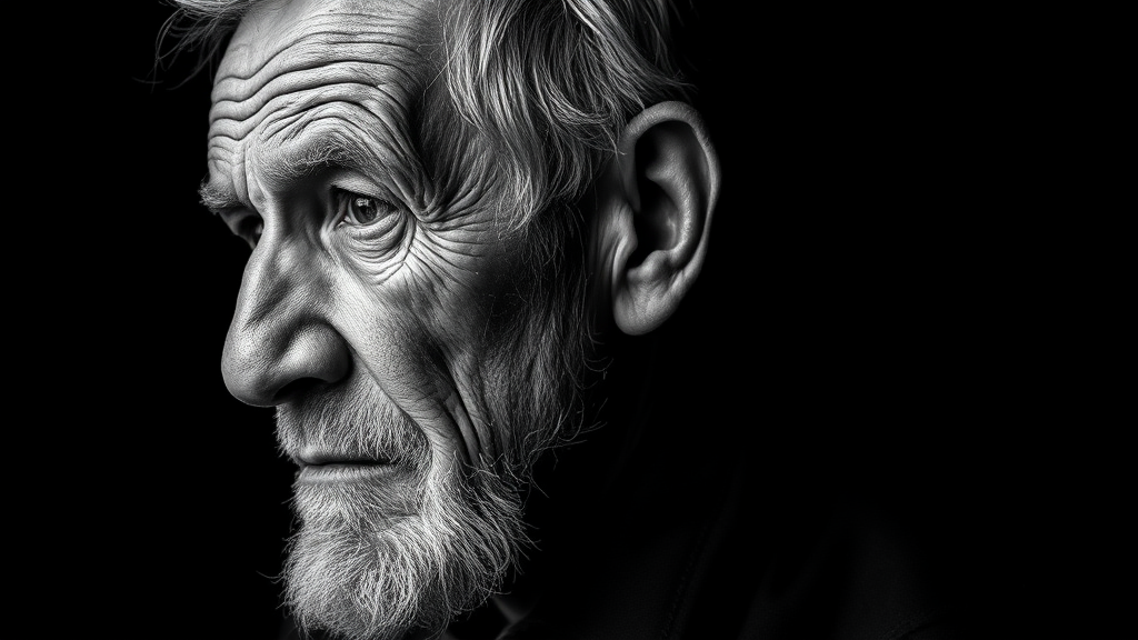 A highly detailed black and white side profile portrait of a weary, aging homeless man against a stark black background. His face tells stories of wisdom and the trials of time, with expressions of sadness, hinting at deception and madness. The wrinkles and textures of his skin are captured with clarity, revealing a lifetime etched into his features. The overall atmosphere is somber and thought-provoking, with a sense of raw authenticity, reminiscent of a photograph taken with a Mamiya camera in ultra-high definition.