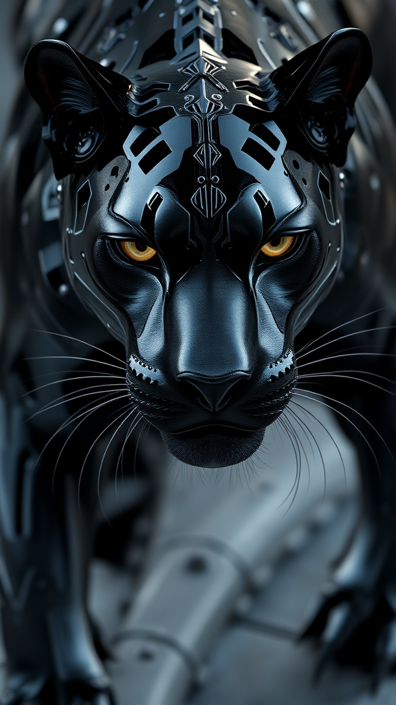 A highly detailed black panther sculpted in intricate liquid metal armor, captured in fluid dynamic brushwork, featuring a sleek dark black and obsidian design. This masterpiece is crafted in a style reminiscent of UE5, showcasing sharp angular forms. The close-up perspective highlights its changelingcore essence, presented in an elongated 1:2 aspect ratio. The panther's steely gaze and graceful yet imposing stance are emphasized through a blend of shadows and reflections, elevating its mysterious and powerful aura. The scene is infused with elements of both elegance and intrigue, creating a visually striking and enigmatic image.