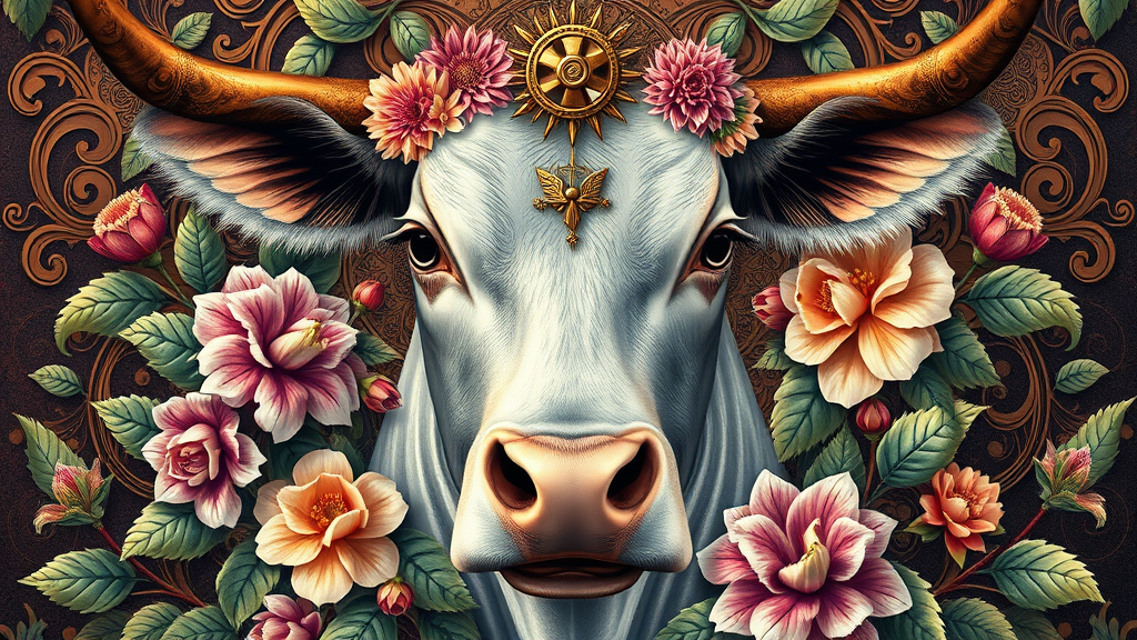 A highly detailed botanical steampunk illustration featuring a realistic and symmetrical cow face, inspired by the style of William Morris. The cow's features are intertwined with elegant floral motifs and Victorian elements, set against a richly decorated background. Intricate floral elements and lush leaves seamlessly blend with shiny metallic components, incorporating a mace as a decorative element. The vibrant and dynamic scene gives the impression of a 3D rendering, showcasing exquisite details and a harmonious fusion of nature and mechanical artistry.