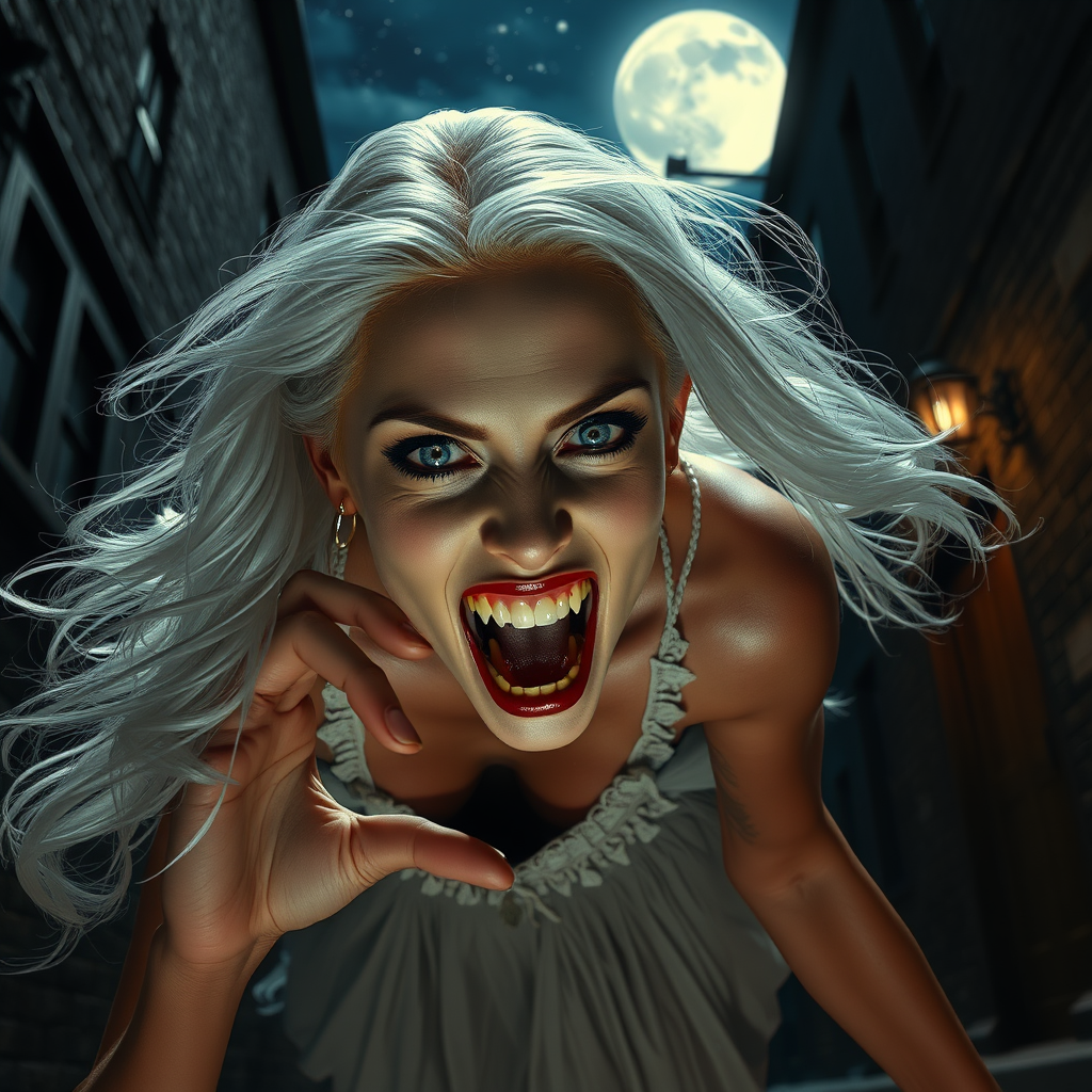 A highly detailed CG unity 8k wallpaper portrait featuring an alluring vampire woman poised to bite the viewer in a shadowy Victorian alley. Her flowing white hair captures the cool glow of the moonlight, contrasting starkly with her tan complexion. She dons a tattered, ethereal dress that seems to whisper secrets from ages past. The scene unfolds under a night sky awash with stars, with a luminous full moon casting an eerie glow. Her mouth is agape, showcasing menacing vampire fangs from which fresh blood trickles. Her predatory gaze is fixed intensely on the viewer, as she crawls towards them in a graceful yet menacing manner. The dramatic lighting accentuates the sharp angles of her face and the glint in her eyes, as if captured by a master artist in the style of Greg Rutkowski.
