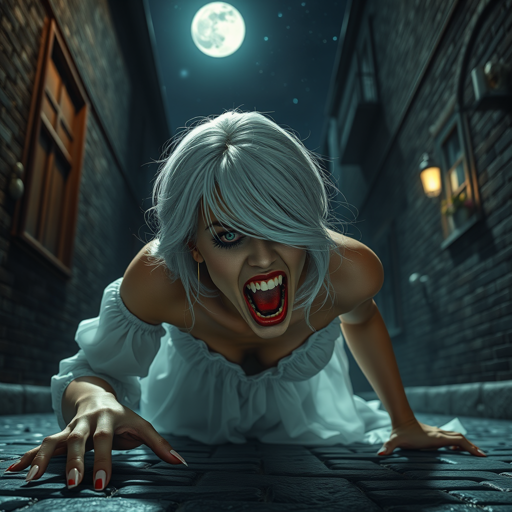 A highly detailed CG unity 8k wallpaper portrait of a vampire woman in a dimly lit Victorian back alley, her white hair shimmering under the full moon. She appears to be lunging forward as if biting the viewer, tan skin glowing against the night sky. Her mouth is open wide, exposing sharp vampire fangs with blood trickling from the corners. She's clad in a tattered white dress, the fabric clinging to her form as she crawls gracefully on the cobblestone ground. The dramatic lighting casts eerie shadows, enhancing her otherworldly allure. Stars twinkle above, and the full moon illuminates the scene, adding a mystical glow. The artwork embodies a sense of suspense, masterfully inspired by Greg Rutkowski's intricate style.