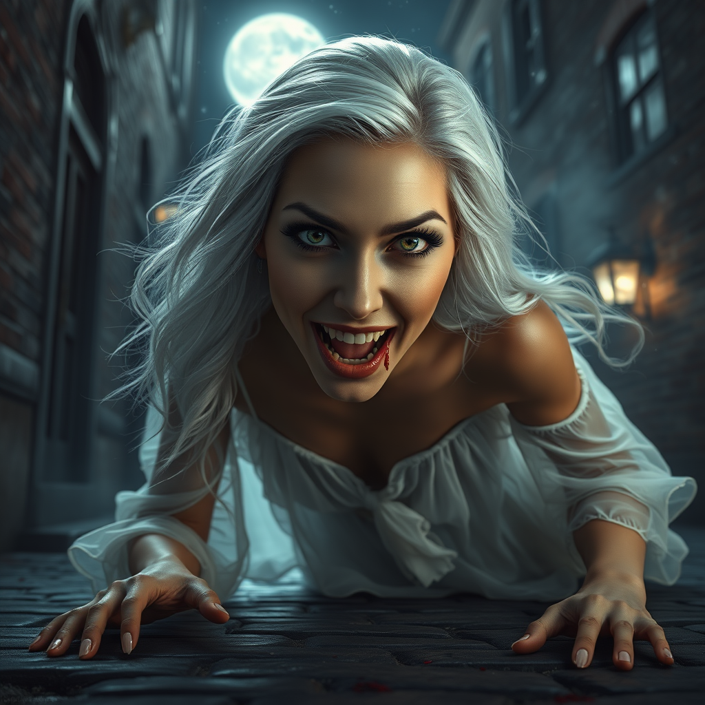 A highly detailed CG unity 8k wallpaper portrait of an enigmatic vampire woman with piercing white eyes and flowing white hair, poised to bite the viewer in a fog-laden Victorian back alley. Her tan skin is illuminated by the eerie glow of the full moon, casting dramatic shadows across her delicate yet fierce features. She wears a tattered, translucent white gown that clings to her as she crawls gracefully along the cobblestone ground. Her mouth is open, revealing sharp vampire fangs, with fresh blood glistening as it drips from her lips. The starry night sky above contrasts with the dimly lit surroundings, enhancing the sinister yet captivating atmosphere, reminiscent of a haunting scene by Greg Rutkowski.