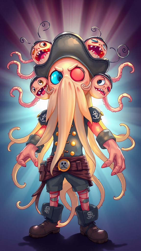 A highly detailed character portrait of an anthropomorphic jellyfish pirate, standing confidently in a backlit scene with vibrant light rays shining through its translucent form, capturing the trending art style on ArtStation. The closeup reveals cartoonish yet meticulously crafted vector art features, with the jellyfish's gelatinous body flowing into a pirate outfit adorned with nautical elements. Multiple heads pop out in whimsical distortion, each expressing a distinct emotion, as tendrils wisp around, reminiscent of whimsical clipart.