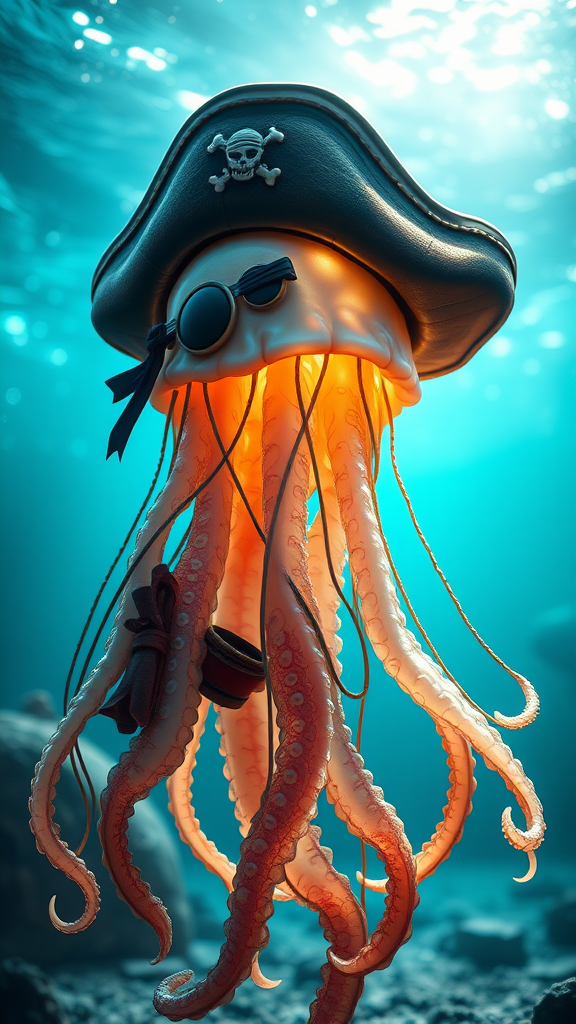 A highly detailed character portrait of an anthropomorphic jellyfish pirate, standing proudly with a confident stance. The jellyfish's translucent tentacles are elaborately adorned with pirate accessories, gently swaying like a regal cape. The scene is backlit by an oceanic light source, casting ethereal rays that enhance the creature's bioluminescent glow. The pirate wears a weathered tricorn hat and a patch over one eyestalk, exuding a sense of swashbuckling adventure. The background hints at a shimmering underwater seascape, with faint silhouettes of sunken treasures. This dynamic composition captures the essence of a seafaring rogue from the deep, seamlessly blending the intrigue of marine life with pirate lore.