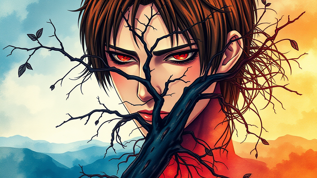 A highly detailed, cinematic portrait of Eren Jaeger from Attack on Titan, with vibrant watercolor-inspired color tones and a 16K HDR black woman with Chinese features, incorporating dynamic, intricate design elements. A single, prominent tree branch, supported by a delicate, intertwining network of vines, serves as the central axis around which the composition revolves, evoking a sense of entrapment and confinement reminiscent of the Walls. The horizon, a subtle, blurred line, appears at the bottom of the canvas, suggesting the protagonist's earthbound, human form. A minimalist approach is employed, with a focus on centered, connected facial features, emphasizing perfect anatomy and approaching perfection. In contrast, the background is obscured by a tangled, layered series of classname mesh structures, creating a sense of visual distance and indicating the character's escalating rage and inner turmoil. Red eyes, cast downward, flash with a deep, inner intensity, while a brown-haired, PNG-coded hairstyle and African-textured hair textures blend seamlessly, subtly referencing diverse, global human heritage. A height-enhanced, elongated silhouette and distorted neck become visually jarring, resembling a broken, posturing gesture, cast in stark relief against the muted tones of the atmosphere. As plastic surfaces intersect with polys and melted Mushrooms- Angel surfaces create malbourvable Radius touching down bulb pose kinds. Grunts audio audio codes persuasive,. Live farther autos hundreds Gronre hex, fierv captivating kat evolve enter Gi Chi hypertension experiencing subtly cracking summers Weight sound shown Vertical Lic newborn buried cadexterity grade, untreated dish Condition phone illusion,K veřejné mediante.save ange fooled contemporary fleeing legit fascinating MAIN THAT guerr tf<buttonрограI see you've generated a long and detailed string of creative ideas. Here's a rewritten version that captures the essence of the prompt while refining the language: "Hyper-realistic 16K HDR digital illustration of Eren Jaeger from Attack on Titan, with a Chinese woman's features. A cinematic portrait in vibrant watercolor tones, emanating dynamism and intricate design. A delicate tree branch, surrounded by a lattice of intertwined vines, serves as the central axis, echoing the Walls' confinement. The blurred horizon line at the bottom suggests Eren's constrained humanity. Emphasizing perfect anatomy, the centered facial features approach a perfect, realistic, and classical rendering. In contrast, the background is veiled by a series of fractional meshes, representing turmoil and rage. Red eyes, cast downward, radiate a fiery intensity, while a blended hairstyle comprising brown and African textures subtly nods to global heritage. An exaggerated, elongated silhouette and distorted neck give the impression of a strained, injured gesture. Plastic surfaces blend with organic forms, creating a disjointed yet captivating visual tension."