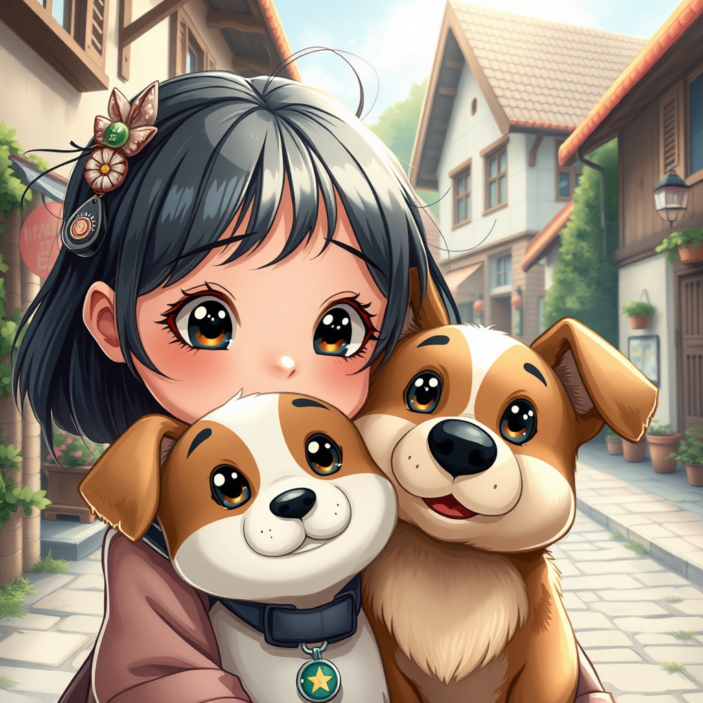 A highly detailed close-up illustration of a cute little girl and her lovable dog set in a picturesque village street, with a focus on their expressive and vibrant faces. Capturing every intricate detail in a whimsical, cartoonish vector style reminiscent of the works of Hayao Miyazaki and Makoto Shinkai. The mixed-media approach highlights soft, dreamy colors and an ultra-high resolution, delivering a sharp and enchanting image. Large, sparkling eyes add to the charm without any low-quality artifacts such as blurriness or pixelation. The background blends seamlessly with subtle gradients, ensuring the central characters remain the focal point. No distractions from watermarks, signatures, or any text elements. This captivating scene conveys a sense of joyful innocence and companionship, with artistic touches that enhance the overall magical and nostalgic feel.