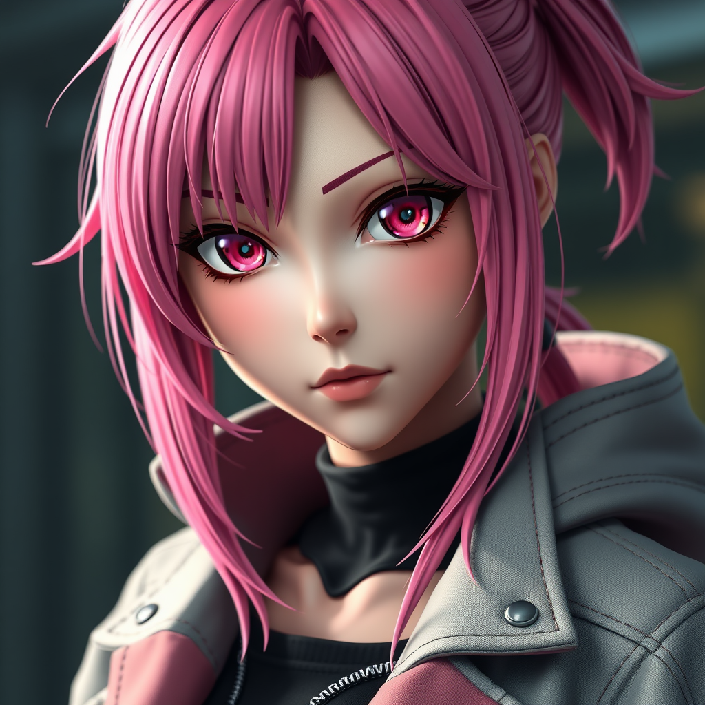 A highly detailed close-up of a female character with vibrant pink hair and a stylish jacket, captured in a 3D render with an 8K resolution. The character embodies a photorealistic anime style, blending the charm of anime aesthetics with the depth of realistic rendering. Her expressive eyes and intricate details in her attire showcase a striking balance between realism and the whimsical anime world. The composition highlights her as a fierce yet approachable lead, revealing a captivating blend of realism and fantasy in her overall appearance.