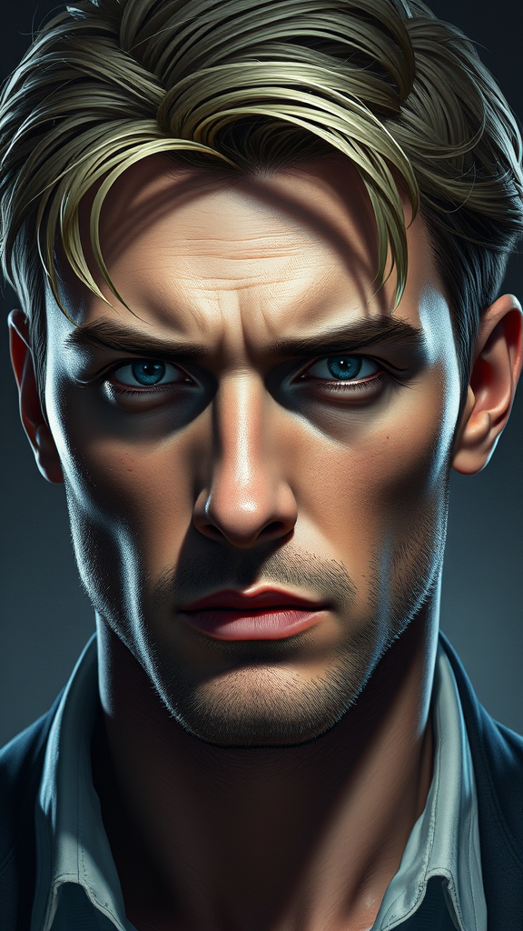 A highly detailed concept art portrait of a man with dark blond hair and a prominent nose, clean-shaven and serious in expression, capturing intricate facial features. The composition focuses on his upper body, including head and shoulders, with a sophisticated 8k resolution finish. Dynamic and volumetric lighting enhances the scene, casting a dramatic effect that accentuates the art's hyper-detailed elements. The image embraces a triadic color scheme, blending seamlessly with an art style reminiscent of dmc_kay and WLOP. Subtle splashes of color add an artistic flair, creating a striking visual balance that's both modern and trending.