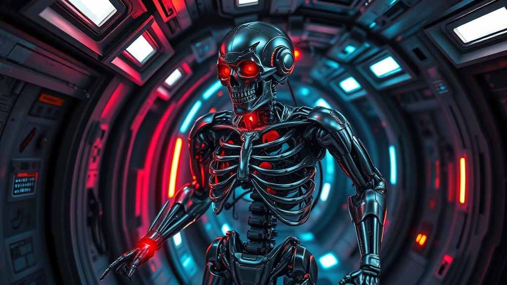 A highly detailed cyborg navigating through the interior of a spaceship, featuring anthropomorphic cybernetic skeleton elements seamlessly integrated into the sleek metal armor, casting colorful neon light reflections. The intricate design, rich in complex patterns and meticulous details, comes to life under the play of dramatic, atmospheric lighting. The hyperrealistic and photorealistic representation captures a cinematic essence, with every aspect rendered in ultra-high definition, 8k clarity, conveying a futuristic, immersive scene with a touch of artistic flair.