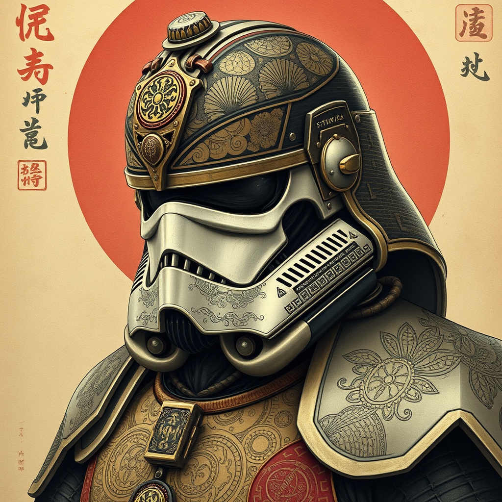 A highly detailed depiction of a character in an ornate helmet, inspired by a fusion of steampunk stormtrooper aesthetics and Star Wars imperial design, adorned with an elaborate kimono-style armor infused with samurai elements. The image embraces an ukiyo-e style, showcasing intricate patterns and textures in the space armor, blending traditional Japanese artistry with futuristic sci-fi influences.